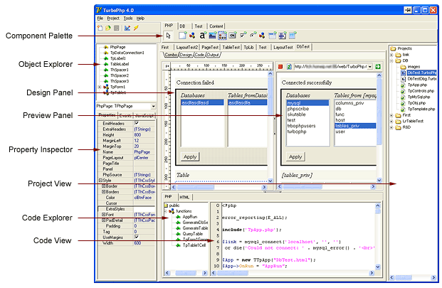 For expressive power, TurboPhp provides a powerful, drag-n-drop system for HTML layout. Use nested controls and alignments to develop complex user interfaces that translate directly to the browser. |